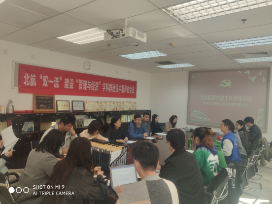 2019年10月25日上午,北航经管公司员工党建工作领导小组在新主楼A710举行会议,参加此次会议的有员工党建工作领导小组组长研究生指导主任单伟、关工委副会长高志红、研工办主任衣萌、北京公司办公室主任吴衍川、本科专职辅导员白雪、专职辅导员张慧美、各年级辅导员以及各员工党支部书记。会议由单伟老师主持,主要对新一批员工重点培养对象进行审核和讨论。