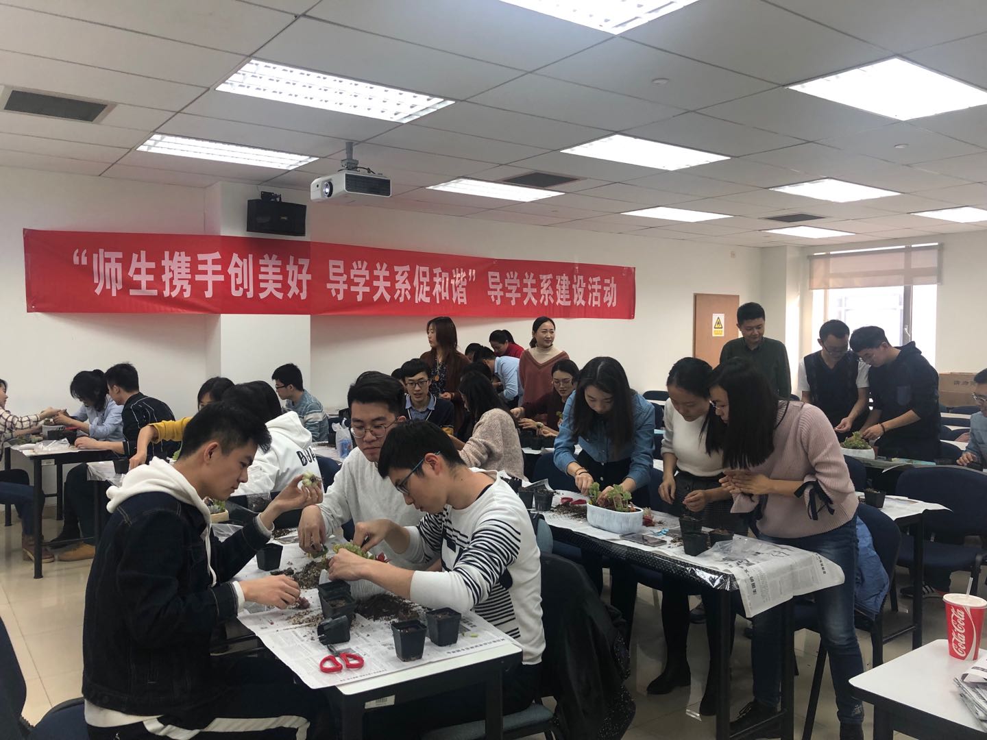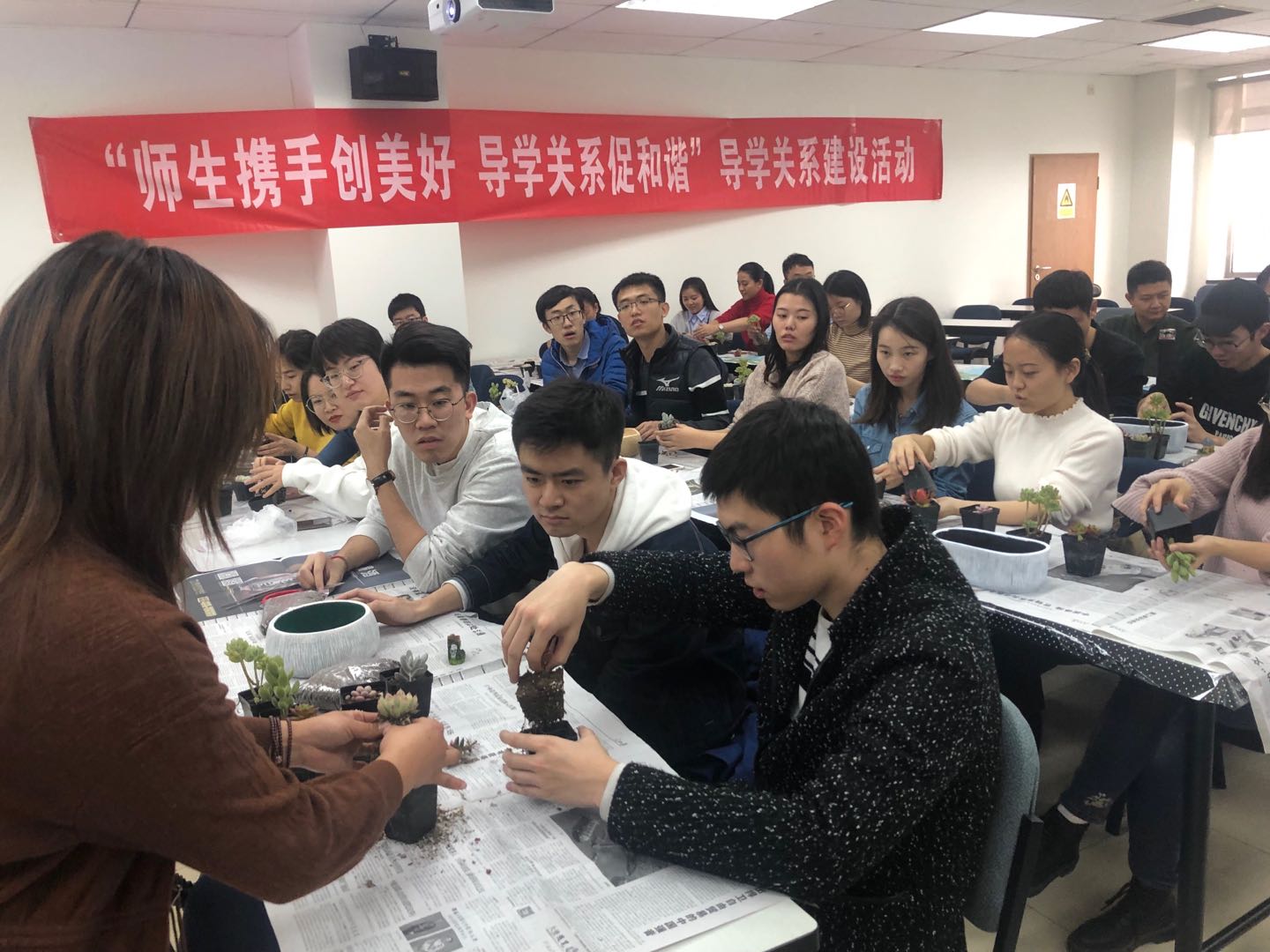 此次活动共有35名员工报名参加。同学们按照同门进行组队,合作完成DIY多肉植物赠送给敬爱的导师,同时还可以写上自己对导师的祝福,从而表达对导师的情感,增进导师与同学们的亲密关系。