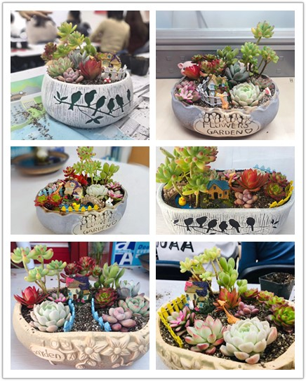 接下来同学们纷纷发挥各自的想象力,设计花盆中的多肉植物的位置摆放,并填上培养土。一盆多肉植物就大功告成了。