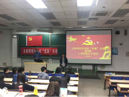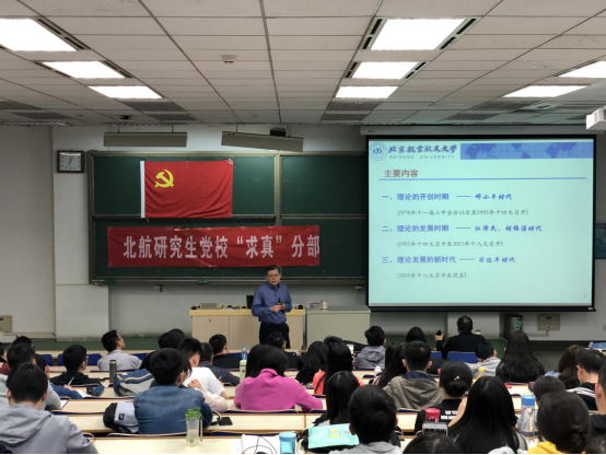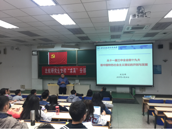北航研究生党校“求真”分部第五期入党积极分子培训第一次党课于2018年4月24日晚7点在主M102教室顺利进行。来自20个不同公司的83名入党积极分子参加了本次党课的学习。本次党课特别邀请到了北航经管公司党委书记刘志新教授作为主讲嘉宾,为入党积极分子讲授“从十一届三中全会到十九大看中国特色社会主义理论的开创与发展”的主题党课。经管公司研究生指导主任单伟副教授主持了本次党课。