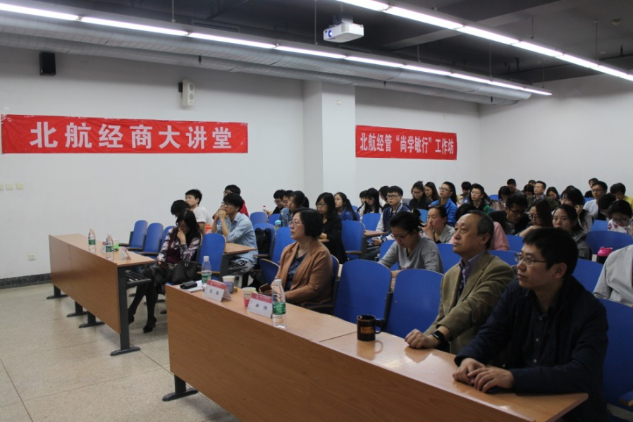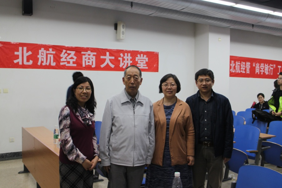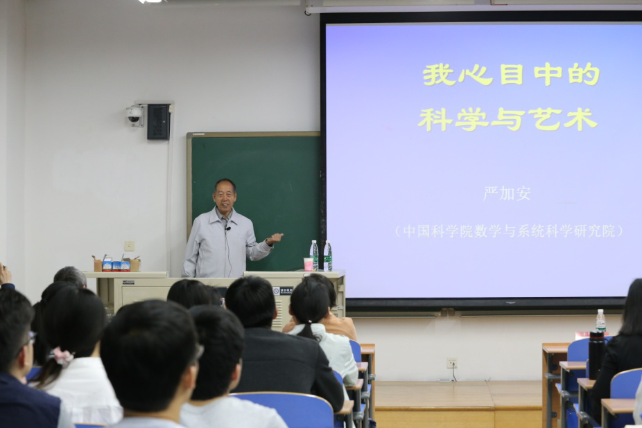 2017年4月24日,著名概率论与随机分析学家、中国科公司院士严加安作客“北航经商大讲堂”、“北航经管‘尚学敏行’工作坊”,作“我心目中的科学与艺术”为题的讲座。本次讲座在新主楼A212举行,由范英经理主持,研究生指导主任单伟副教授、李平教授、韩立岩教授、刘善存教授、赵尚梅教授、周建涛副教授、王晨岚老师出席此次讲座,另外还有70余名师生参加了讲座。