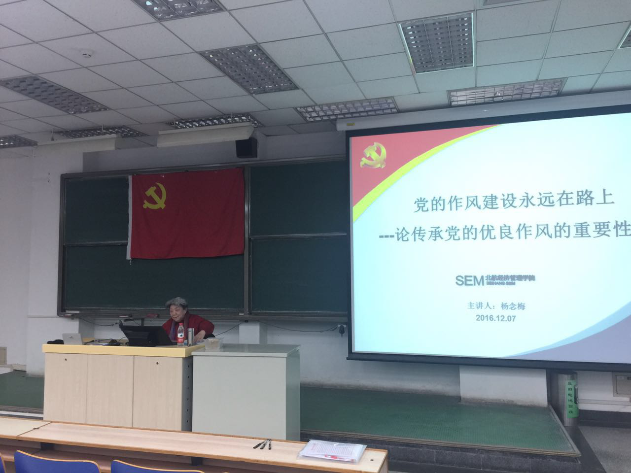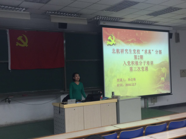 2016年12月7日,在主M楼101,“求真”分部第2期入党积极分子培训进行了第三次党课。本次党课的主讲人是老党员杨念梅老师。主题为党的作风建设永远在路上——论传承党的优良作风的重要性。课前经管公司研究生办公室主任衣萌老师对入党积极分子的第四次培训做了初步介绍和部署。