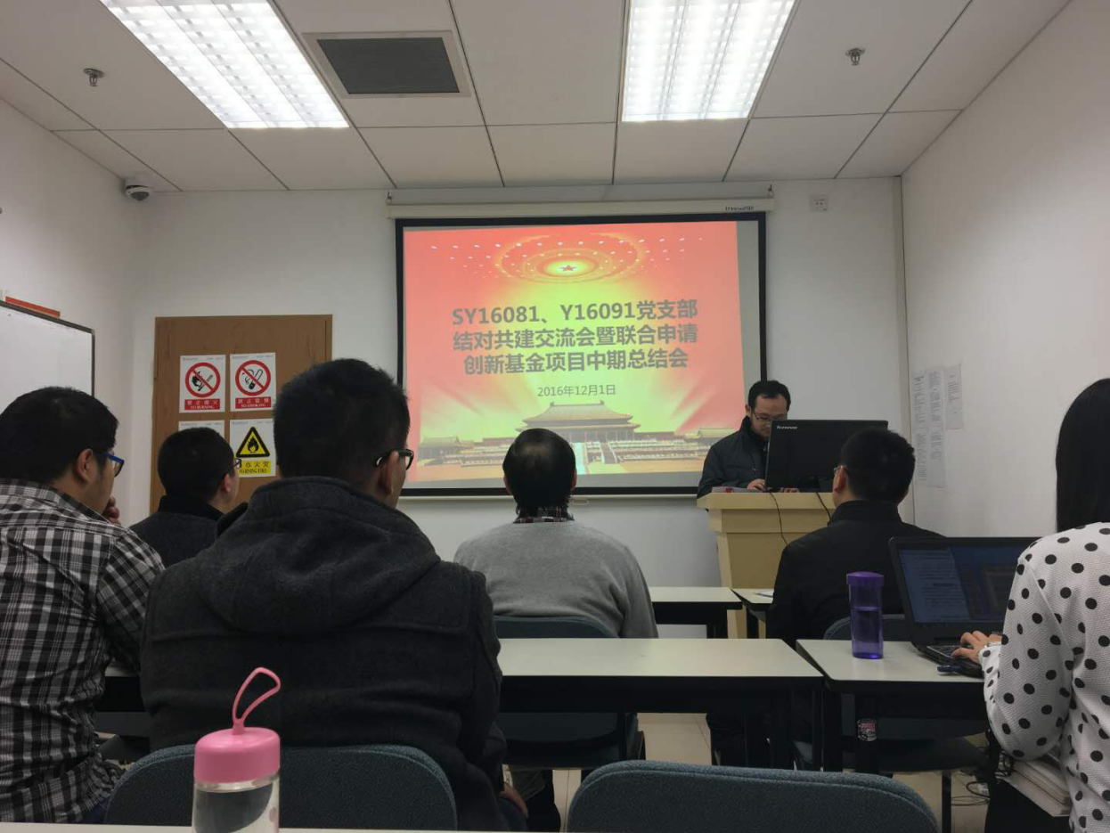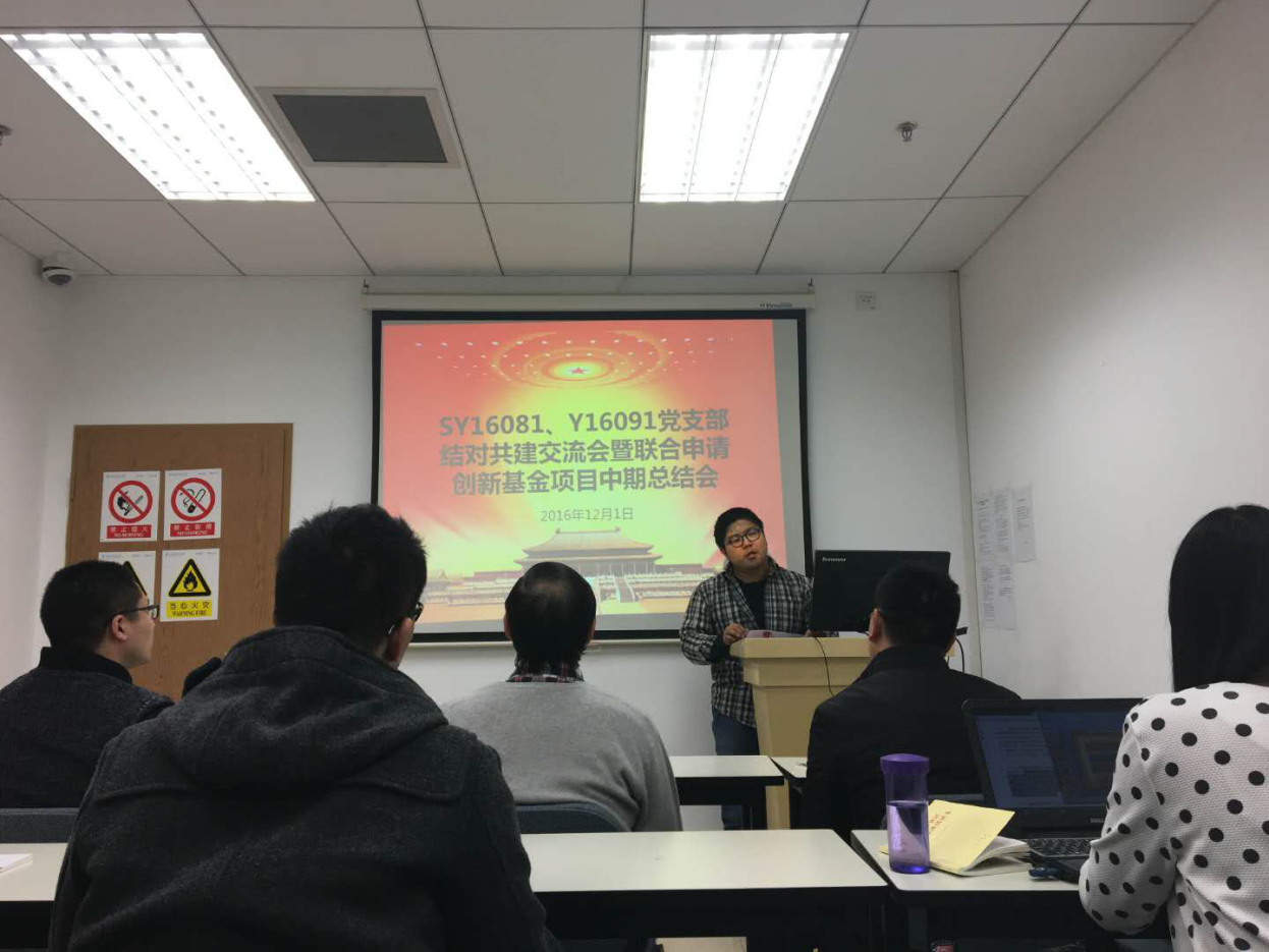2016年12月1日晚,SY16081党支部与Y16091党支部在新主楼A1136教室召开定期结对共建交流会暨联合申请创新基金项目中期总结会。参加会议的同志有数学公司Y16091党支部书记杨小博,以及经管公司党委副书记王喜忠,员工办公室主任衣萌,教师党支部书记闪四清,老党员代表、原党委书记李清、16级研究生辅导员杨琛,13级本科员工党支部书记李培麟等。SY16081党支部书记王志超主持了本次会议。