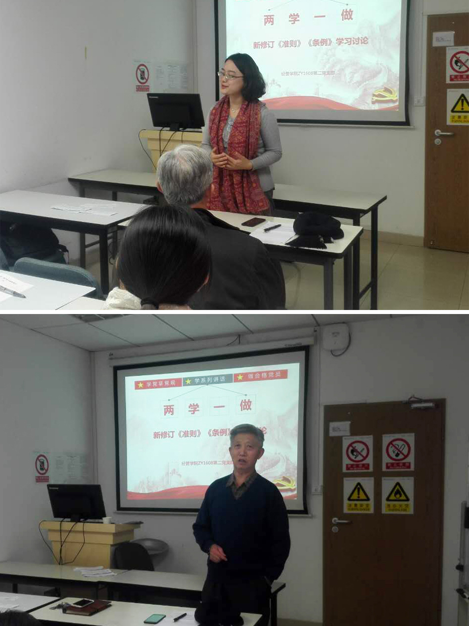 11月28日,经管公司ZY1608第二党支部召开党员大会,围绕《关于新形势下党内政治生活的若干准则》和《中国共产党党内监督条例》举办微党课进行学习交流,副经理牟晖老师、离退休教工党支部书记李清老师到会指导。