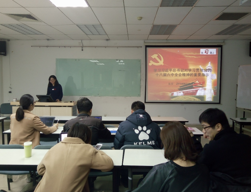 本次会议学习由吴莎同学主讲,主要就十八届六中全会提出的重大理论观点进行学习。从一个核心,四个意识、四个自信、四个全面这四个方面带领大家学习了这次六中全会提出的新思想。进一步温习了党的领导方针以及回顾了党的历史轨迹。其他同学也就此发表了积极的讨论。