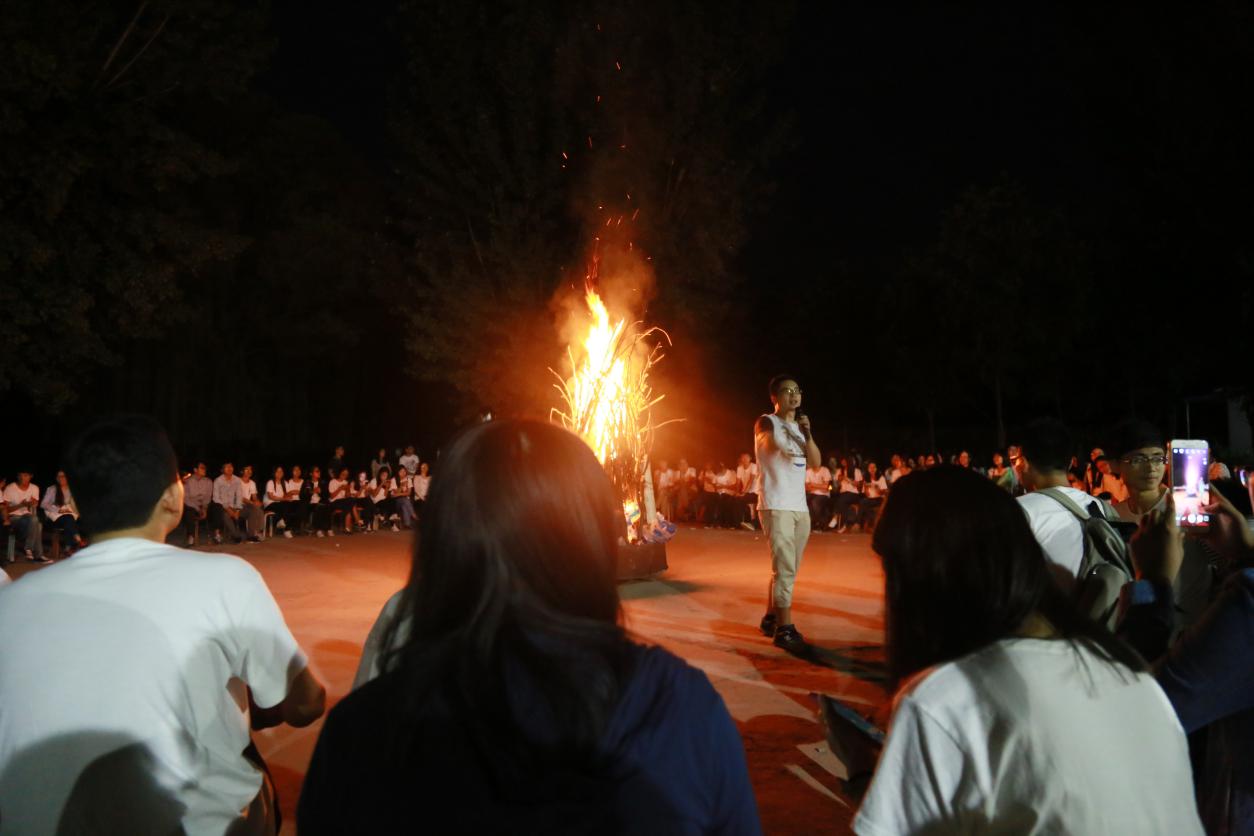 10号晚上,在拓展基地,全体同学在导员们的带领下开展了新奇有趣的篝火晚会,在晚会上,大家积极踊跃表演节目,气氛十分欢快,大家情绪热情高涨,篝火的火焰缓缓熄灭,大家都不忍离去。