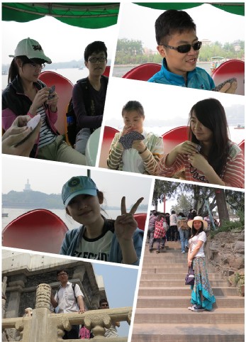 从船上下来,遇到林荫道,高大的树木郁郁葱葱,枝繁叶茂,几乎看不到天空,路两边芳草青青,绿意如织,同学们都被这景致所感染,非常喜欢宁静而安祥的环境。不一会儿,琼华岛就呈现在眼前,站在陡山桥上望去,右边一片杨柳飘飘,湖水荡漾,左边湖面荷叶铺满水面,菱荷滴翠,白塔立于琼华岛之巅,像一尊神圣的白衣女神,显得婷婷玉立。来到山顶,我们仿佛被绿染成的画卷所包裹,那两岸坡坡岭岭重重叠叠直矗云天的林木,全染上绿色,让人真正体味到了绿的风彩。站在白塔下,眼前就是烟波浩渺的北海,沿着塔四下观望:景山的“万春亭”,金鳌玉栋桥、中、南海及故宫尽收眼中,好一派壮丽风光!