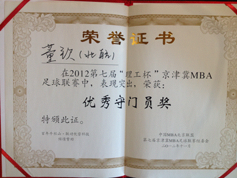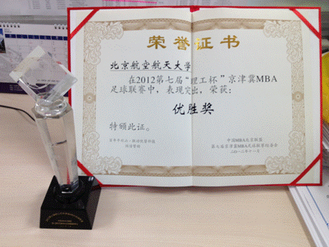 2012年11月25日,第七届“理工杯”京津冀MBA足球联赛,历时一个月终在北京理工大学圆满落下帷幕。北航MBA员工积极参加其中,凭借顽强的拼搏精神和良好球风获得优胜奖及优秀门将荣誉。