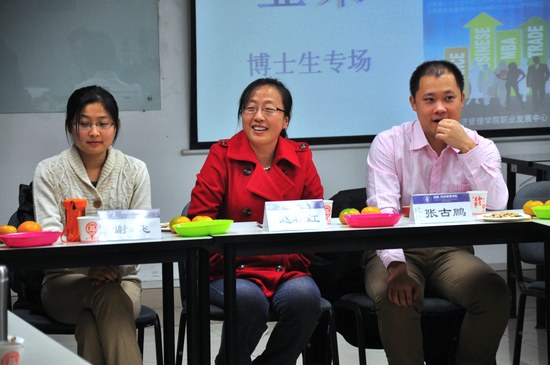 之后各位学长学姐分别向博士生们介绍了自己学习和工作的经历以及获得的经验教训。张古鹏学长向同学们介绍了自己从事科研的方法,提出专心致志对于科研工作的重要性。邓婉君学姐以自身经历告诉了博士生生涯要有目的性,争取能够提早毕业,并为在座的女生提供了自己找工作的经验。王科学长从三个方面向致力学术研究的同学们介绍了自己的经验,如要注重锻炼思维方式和表达能力,研究必须要全身心投入,注意干中学,学会选择研究方向。谢飞学姐从一个直博生的角度告诉大家如何尽快找到前进方向,如何避免为了基础打基础,坚持对于科研的重要性。黄帝学长介绍了自己如何在从事科研同时不落下社会活动。