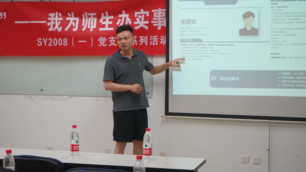 随后,由MBA20083班临时党支部带来互联网、会计、人事行业专场职业分享。在互联网行业工作的张建军学长选取同学们在之前前期职业发展调研中的问题进行了针对性的解答,主要集中在简历、实习的重要性、工作感受等方面,他建议简历要有结构化的输出,他表示要学会和HR解读以往实习,体现对自我角色的认知能力,他谈到在相对公平的组织环境可以找到自己的成就感,在模糊的组织环境里,直属上级的能力是重要的决策依据,同时他鼓励同学们要学会通俗易懂的把专业术语表达出来,学会自我展示。