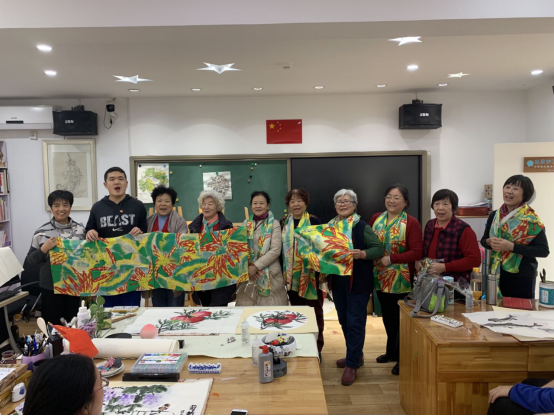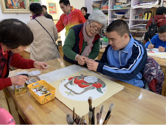 到达培智公司时,活动已经开始了,来到现场的除了志愿者,还要一些自愿来帮助孩子们学习画画的奶奶。培智公司的老师对参与本次活动的志愿者进行了简单介绍。活动的第一环节是孩子们选择想要学习的画作,选择后由志愿者和奶奶们指导孩子完成绘画。在绘画过程中,参与本次志愿活动的同学们与孩子们进行了深入交流,一同完成了中国画的绘制,完成后与奶奶们交换礼物。