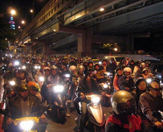 台湾的城市里摩托车尤其多,本地人都管这个叫机车。绝大部分是木兰型的,可是都开得飞快。听这里的同学说,没上80迈就觉得不爽,上100是很正常的……不过由于城市里几乎每个路口都有红绿灯,而且所有的人都极遵守交通规则,也会让着自行车和行人,也绝少有鸣笛的,所以只要不违规,还是很安全的。