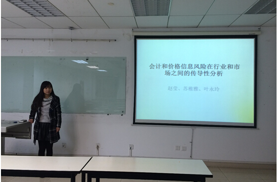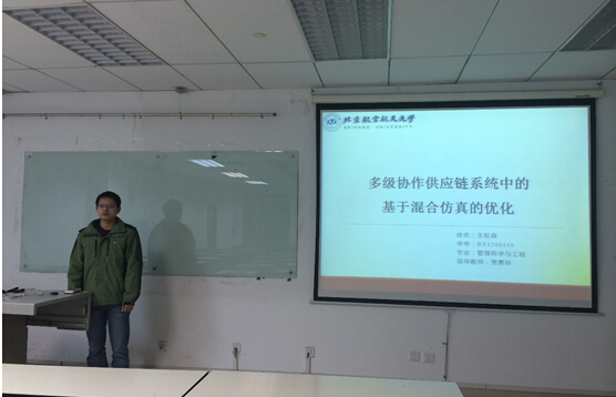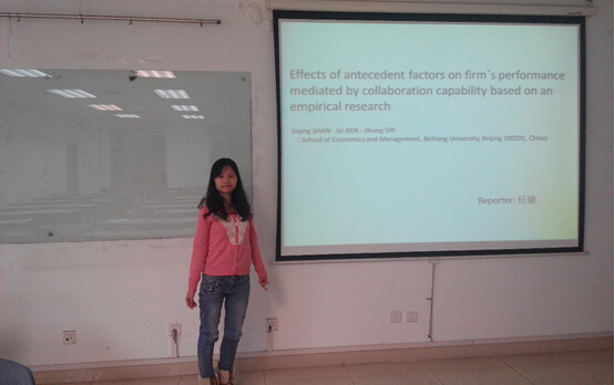 第一位宣讲人是王虹森,题目是《多级协作供应链系统中的基于混合仿真的优化》,首先建立了一个多级协作供应链系统,包含一类优化供应链整体成本的问题,多个参数需要优化。然后详细展示了将系统动力学模型转化为Matlab程序模型的方法。再利用遗传算法求解该优化问题,结果证明得到的解比试凑法更优。第二位宣讲人是苏稚雅,题目是《The risk transmission analysis of accounting and price information》,通过分析相互影响的季度增长率会计收益和市场基础产业和其上游的回报,以及下游产业及其相关产业,研究风险的传播路径,方向和其他有趣的问题,从而给出这个风险传递控制的一些建议。第三位是任婕,题目《Effects of antecedent factors on firm`s performance mediated by collaboration capability based on an empirical research》,利用部署信息技术与经验的企业收集的数据,以进一步确定协作能力的前因和证明其对企业绩效的积极和显着的效果研究。论文作者的精彩讲解赢得了在场同学的热烈掌声。