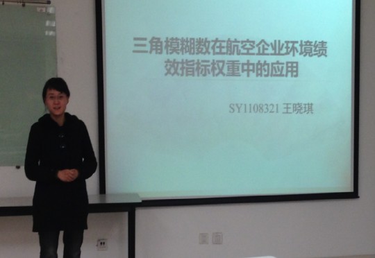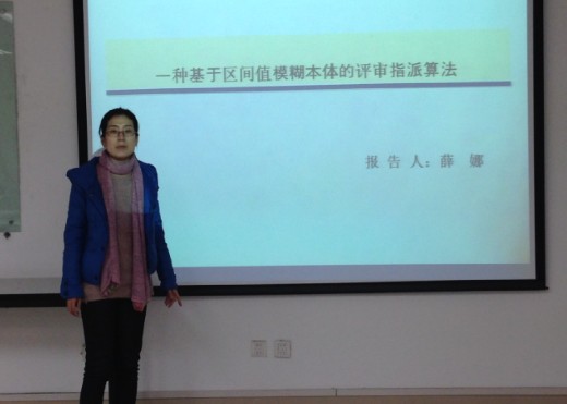 宣讲会的第一位宣讲人是薛娜,她的论文题目是《一种基于区间值模糊本体的评审指派算法》,文章着重研究了专家指派问题,并在区间值模糊本体的基础上,构建了评审指派优化模型并给出算法步骤,并通过数据实验验证了该评审指派算法在匹配上的改进。第二位宣讲人是来自SY11083班的王晓琪,她的论文题目是《三角模糊数在航空企业环境绩效指标权重中的应用》,文章基于环境绩效评价相关文献以及航空企业特点,构建了航空企业环境绩效评价指标体系。运用模糊理论,将模糊的不确定的语言转化为确定数值,从而为航空企业制定环境管理决策提供科学依据,并改善其环境绩效整体水平。本场宣讲会的最后一位宣讲人是郭峰娟,她的题目是《Estimating the threshold of extreme events in China stock market based on DFA》,文章从一个新的视角即采用DFA方法对中国股票市场上极端事件的阙值进行估计,结果表明深圳证券指数收盘价的波动比上海股票指数的波动更频繁,这样的研究结果对中国股票市场的财务风险分析有重要影响。