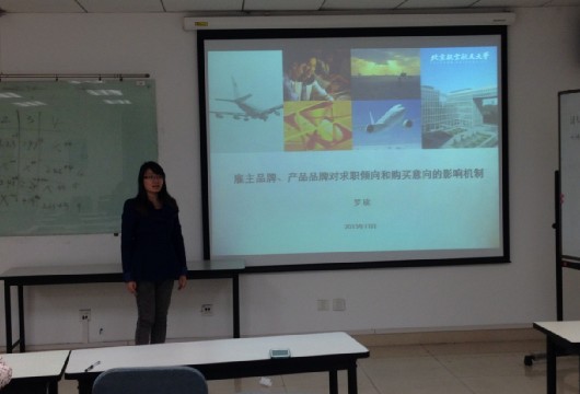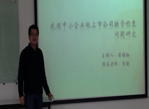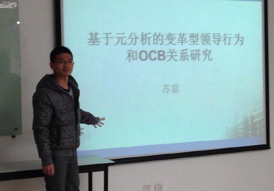 首先上台宣讲的是苏嘉,他的题目是《基于元分析的变革型领导行为和OCB关系研究》,他鉴于变革型领导行为对组织公民行为影响的研究结果不统一,对国内外发表的18篇重要期刊进行元分析,得出变革型领导行为和组织公民行为之间存在正相关关系。接着上台宣讲的是景桔钿,他的题目是《我国中小企业板上市公司融资约束问题研究》,文章希望从融资约束这一新的角度研究我国中小企业融资问题,采集中小企业数据,利用微观模型分析我国中小企业是否收到融资约束以及所受融资约束程度,提出有利于促进我国中小企业融资的政策建议。最后是罗欣,她的题目是《雇主品牌、产品品牌对求职倾向和购买意向的影响机制》,文章对产品品牌和雇主品牌分别假设建模,并进行了一系列的验证和数据统计,论文的结论能够为企业进行雇主品牌建设提供理论依据和指导性建议。