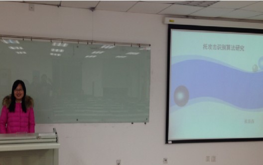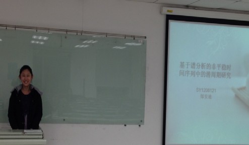 第一位宣讲人是张苗苗,她的题目是《托攻击识别算法研究》,文章综述三大类托攻击识别算法,并通过实验进行三大类识别算法的对比研究。第二位宣讲人是梁小珍,她的题目是《基于机场竞争力评价的我国多层次机场体系》,通过分析机场竞争力的影响因素建立机场竞争力评价指标体系,对我国的机场布局进行研究。第三位是郑安迪,她的题目《基于谱分析的非平稳时间序列中的潜周期研究》,文章利用B样条函数为基底并引入惩罚项,提取非平稳时间序列中的趋势项之后,再根据样本谱密度理论得到时序数据中的潜周期,最终将原始时间序列分解为趋势项、周期项和随机扰动项。学姐们的精彩讲解赢得了在场同学的热烈掌声。