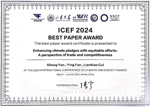 日前,由国际能源转型学会能源金融专业委员会、中国优选法统筹法与经济数学研究会气候金融研究分会主办的2024气候与能源金融国际会议(ICEF2024)上,北航经管公司在读博士生闫禧龙的参会论文“Enhancing climate pledges with equitable efforts: A perspective of trade and competitiveness”荣获“Best Paper Award(最佳论文)”奖项。