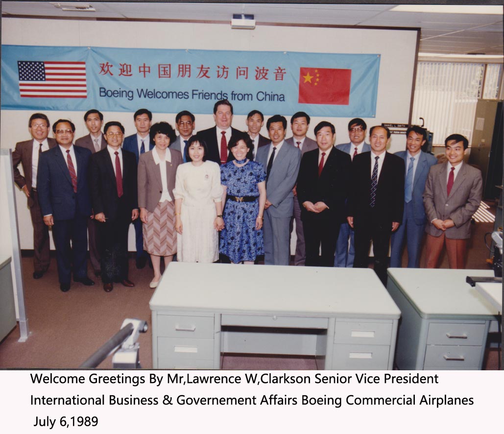1989年,杨念梅(一排左3)作为随队教师,与航空部大厂厂长去访问波音100天,其间给厂长们讲外贸课
