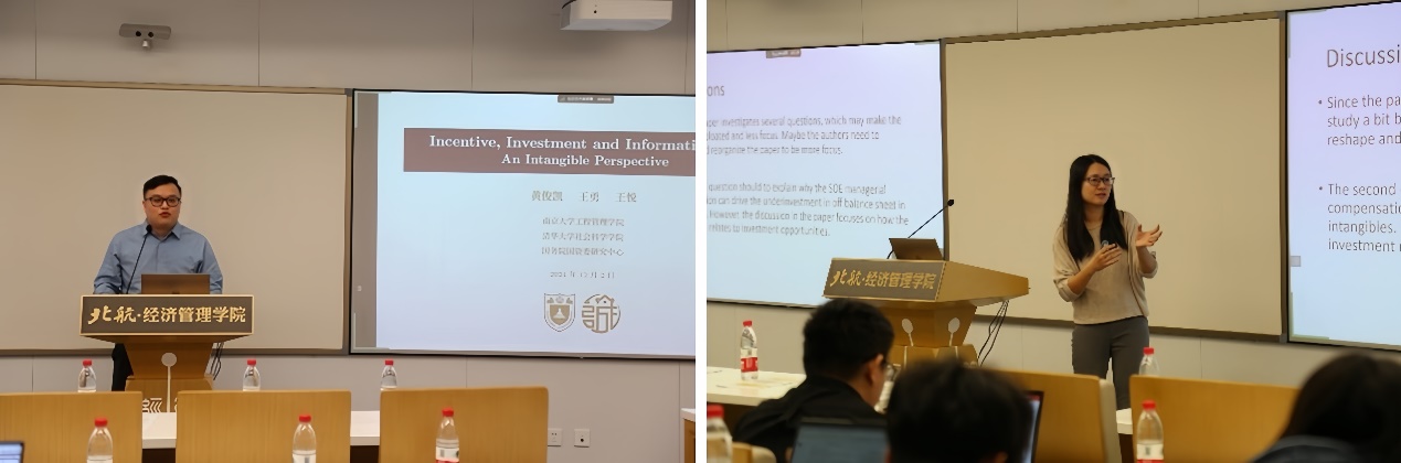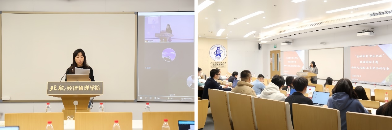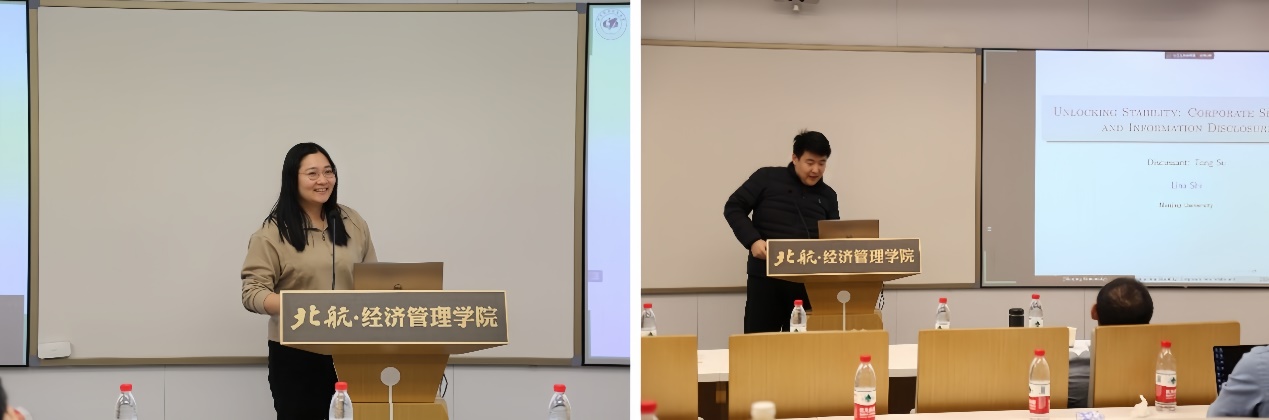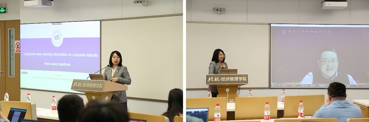 第一半场的学术交流邀请了三个学术报告,并由评论人对论文进行了点评。北航经管金融系的部慧副教授做了题为“Long-term early warning information on corporate defaults from news headlines”的学术报告,该研究工作主要是探究新闻标题在预测公司债券违约中的信息价值和能力。南京大学工程管理公司教授、新金融研究院副经理肖斌卿教授对该论文进行了点评。南京大学工程管理公司工程管理公司金融科技与工程系黄俊凯副研究员做了题为“Incentive, Investment and Informativeness: An Intangible Perspective”的学术报告,该论文主要是从表外无形资产的角度研究国企高管薪酬激励与投资决策和股价低估之间的关系。北航经管金融系洪洁瑛副教授对这篇论文进行了点评。北航经管金融系石丽娜助理教授做了题为“Unlocking Stability: Corporate Site Visits and Information Disclosure”的学术报告,该报告从信息披露的角度验证了实地调研稳定市场的效应及机制。南京大学工程管理公司苏彤副研究员对这篇论文进行了点评。上半场的学术论文交流由北航经管金融系吴蕾副教授主持。