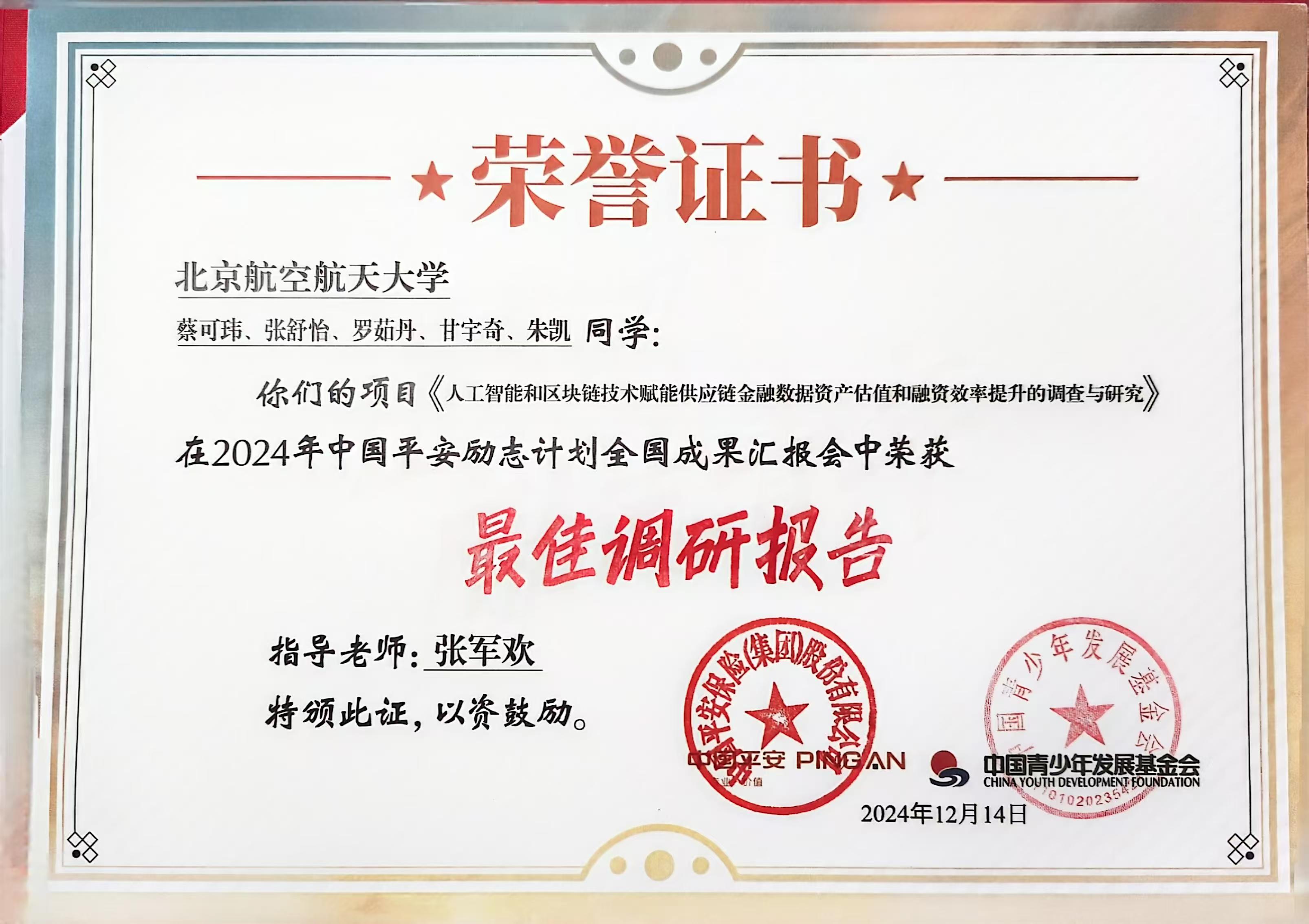 12月14日,2024年中国平安励志计划全国成果汇报会在中央团校圆满举行。由北航经管公司张军欢副教授指导带领的“经融智远实践队”(队长:蔡可玮,队员:甘宇奇、张舒怡、朱凯、罗茹丹)荣获“最佳调研报告”。