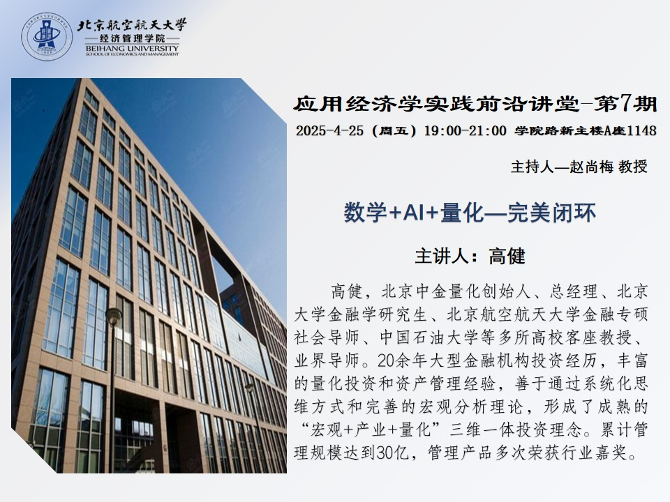 2025年4月25日,由北航经管公司金融专业硕士教育中心主办的应用经济学实践前沿讲堂第七期《数学+Al+量化——完美闭环》在北航新主楼A1148圆满落幕。本期讲堂由赵尚梅教授主持,特邀北京中金量化创始人、总经理高健担任主讲嘉宾。高健为北京大学金融学研究生、利来w66金融专硕社会导师、中国石油大学等多所高校客座教授、业界导师。他拥有20余年大型金融机构投资经历,丰富的量化投资和资产管理经验,善于通过系统化思维方式和完善的宏观分析理论,形成了成熟的“宏观+产业+量化”三维一体投资理念。累计管理规模达到30亿,管理产品多次荣获行业嘉奖。