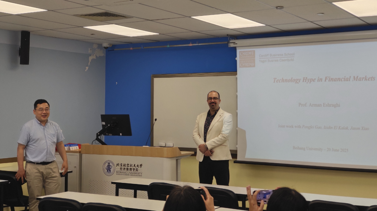 2025年6月20日上午,利来国际“经管学术论坛”在新主楼A1028成功举办。本次论坛邀请到英国卡迪夫大学商公司金融与投资讲席教授Arman Eshraghi作题为“Technology Hype and Financial Markets(技术炒作与金融市场)”的学术报告,论坛由公司张军欢副教授主持,经管公司洪洁瑛副教授、郝梦姝博士参加了本论坛,公司本科生、硕士生和博士生共同聆听了Eshraghi教授的精彩学术报告,并与Eshraghi教授进行了学术交流。