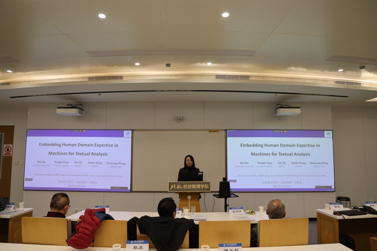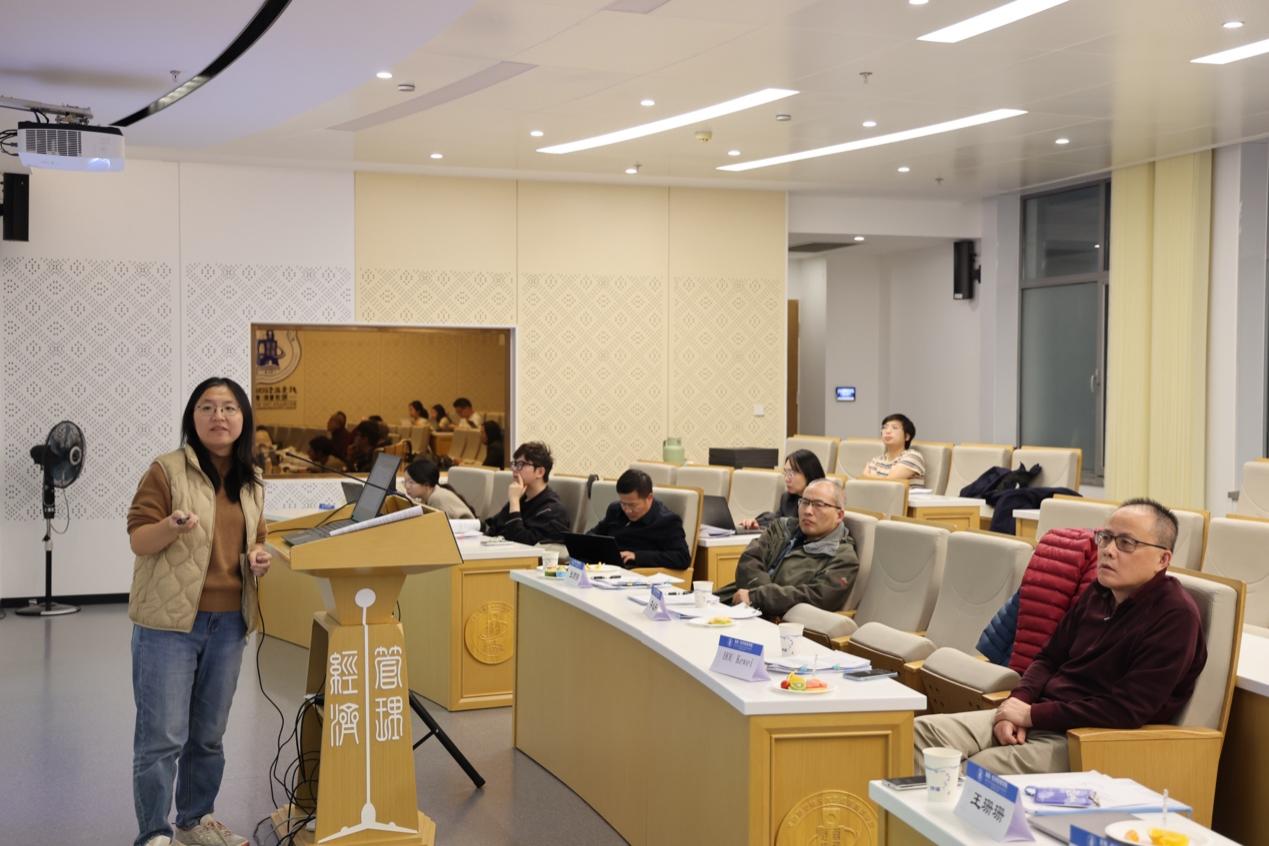 学术论文研讨会环节,首篇论文由郜慧副教授汇报,题目为《Embedding Human Domain Expertise in Machines for Textual Analysis》,该研究系其与唐文金博士、凃俊教授、王军波教授、汪寿阳教授合作成果。侯恪惟教授、李心丹教授、谢静副教授对论文进行点评,论文作者王军波教授、郜慧副教授与点评人展开深入交流。