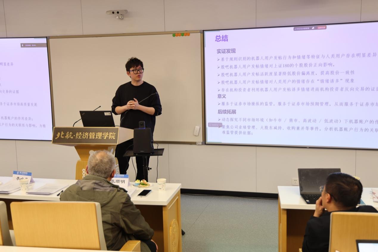 第四篇论文《谁在塑造市场情绪?人类账户 vs. 机器人账户》由上海交通大学、上海商公司顾晨副教授汇报,该论文为其与多位学者合作完成。谭小芬教授、侯恪惟教授、张顺明教授、石丽娜博士担任点评人,论文作者之一郜慧副教授参与学术交流讨论。