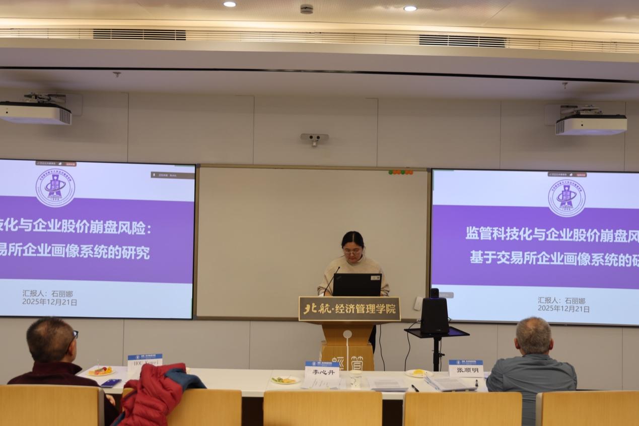 第五篇论文《监管科技化与企业股价崩盘风险:基于交易所企业画像系统的研究》由石丽娜博士汇报,熊熊教授、张顺明教授、郜慧副教授进行点评。论文作者之一谭小芬教授参与研讨,与现场嘉宾就研究核心观点、实践价值等内容深入交流。