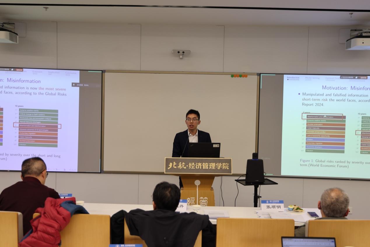 第二篇论文《Too Good to Be True: Misinformation and Ambiguity Aversion》由北航经管公司王论意博士汇报,杨立岩教授、李心丹教授担任点评人。论文作者之一张顺明教授参与现场讨论交流,就研究相关问题深入探讨。