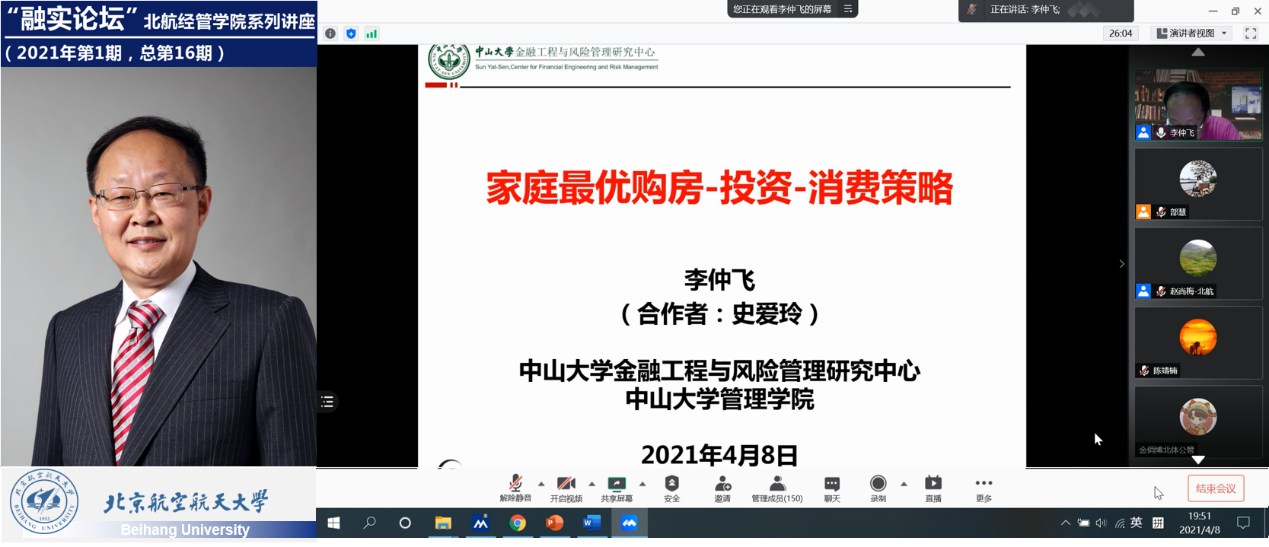 2021学年第1期融实论坛由利来国际金融系部慧副教授主持,金融系主任赵尚梅教授、金融系杨海军教授、洪洁瑛副教授、陈靖楠副教授、李伟博士,行为与运作管理系田琼教授、郭仁拥教授、刘天亮教授等经管公司老师们参与了本期论坛;北航经管公司的博士生、普硕、金融专硕、MBA、MEM、MPAcc以及本科生等各个培养项目的员工们参加了今晚的学术交流活动。同时,本期讲座还吸引了对外经济贸易大学、南京大学、苏州大学、大连海事大学、南京财经大学、南京审计大学、南京师范大学、湖南师范大学、华南师范大学、杭州师范大学、北京第二外国语公司、北京体育大学等院校师生们以及金融业界和实业界的朋友们参与。“融实论坛”2021学年第1期共计151人面在线参与了本期论坛,聆听了李教授的精彩学术报告并与李教授进行了热烈的学术探讨和交流。