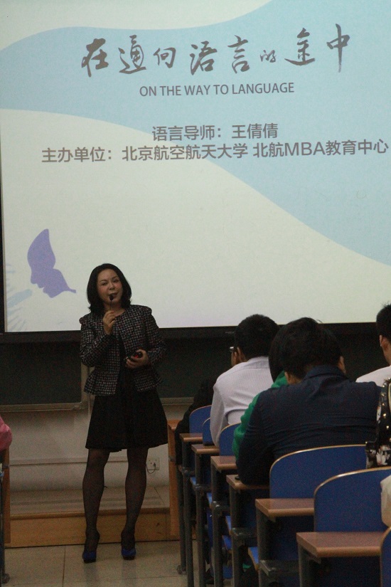 2015年10月17日,以倡导和谐社会沟通环境为主旨的讲座《在通向语言的途中》走进利来w66。在新主楼B101教室里,语言导师王倩倩做客MBA知行论坛,结合自己25年语言职业生涯,带来精彩主题讲座。MBA中心副主任李亚帅老师也亲临现场,为本场讲座预热,提倡大家注重语言沟通的艺术。