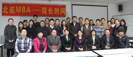 “经理时间”是北航MBA的传统沟通机制,每学期举办一次,旨在过放松、直观的形式,让MBA员工就学习、生活、职业发展等各个方面和经理面对面地交流,同时也帮助MBA同学了解公司最新动态。2015年1月11日晚,本学期“经理时间”座谈会在新主楼A座928教室拉开帷幕。北航经管公司经理王惠文教授、副经理周宁教授亲临现场与同学们亲切交流。MBA教育中心主任柏满迎教授、副主任李亚帅博士、主任助理陈喆博士以及教务主管李慧老师陪同出席本次活动。