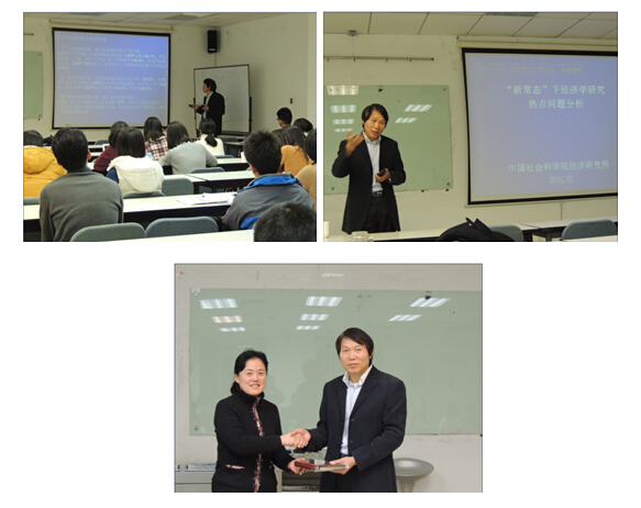 2014年12月8日下午16:00在新主楼A928教室,由院科研办和金融系联合主办了学术高端论坛——“新常态经济学热点问题”。邀请中国社会科公司经济研究所研究员、《经济研究》常务副主编郑红亮教授做学术讲座。