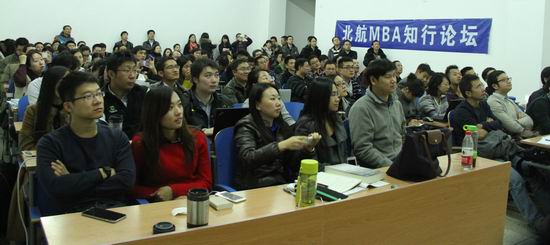 2014年11月22日晚,北航MBA在新主楼B118举行了以《移动互联时代的营销转型》为题的知行论坛。同学们积极踊跃参加,整场论坛座无虚席。甚至许多同学站在走廊上,认真听取了张青春先生的分享。