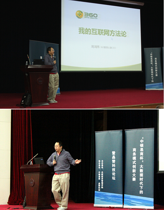 周鸿祎先生为同学们做了题为《我的互联网方法论》报告。与汤奇峰先生展现出的大数据时代巨大机遇不同,周鸿祎从不同角度给有意愿创业的同学提出了自己的建议。周先生还激励同学们,每个人都能创新,但无论从哪方面入手,都是先从用户体验入手,从微小改变入手,做到极致,要勇于探索颠覆式创新。