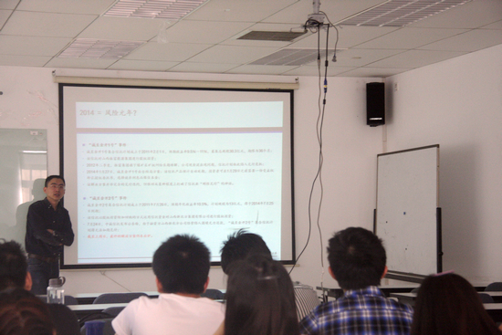 最后,刘继海先生以风险控制为话题,和同学们分享了他多年的从业感受和人生感悟,希望同学们坚持自我,规范工作,在以后的工作中取得更好的成绩。中国的债券市场经历了曲折的发展,在当下仍有巨大的潜力可挖。资产证券化将成为未来中国证券市场的重要战场。中国在这一方面发展空间巨大。有效的信用评级是加快发展资产证券化的内在需求。“诚至金开”“11超日债”事件也许让很多人利益受损,但是打破信用绑架格局,理性回归市场,未来的中国债券市场必将大有可为。