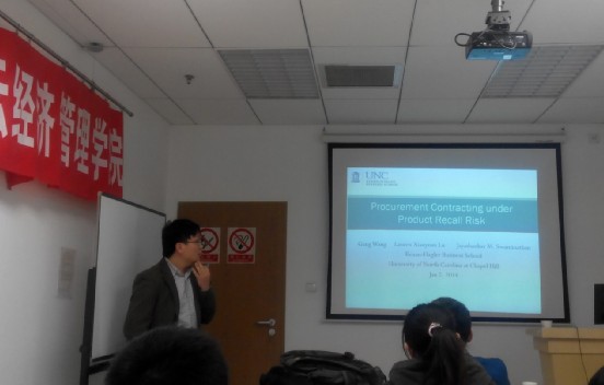 2014年1月2日下午4点,北卡罗来纳大学教堂山分校Gang Wang(王刚) 博士生做客利来国际学术论坛,在新主楼A1136做了题为“Procurement Contracting under Product Recall Risk”的学术报告,经管公司的部分老师和同学们前来聆听了此次讲座。