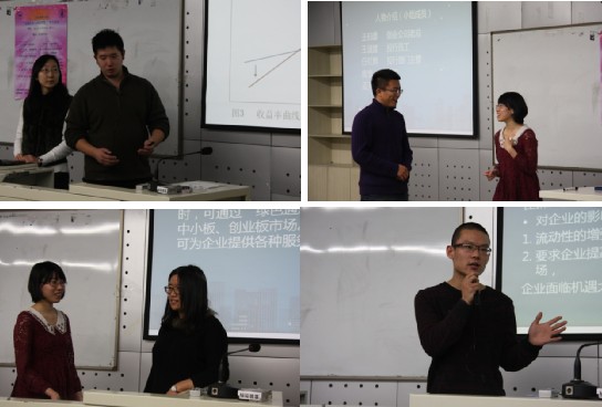 第一组为商业银行组,讨论主题为存款保险制度问题,阐述了存款保险的重要性及复杂性,同时又紧密联系到老百姓的生活。赵尚梅老师是这方面的专家,就这一问题与同学们分享了自己的看法。第二组为股份制银行组,以上海自贸区为背景,以商品贸易为依托分析了小企业与大企业之间再融资渠道创新方面的可行性,启发了大家对融资创新模式的思考。第三组为基金组,以财经新闻播报的新颖形式分析了一只股票型基金产品,从产品研发、投资渠道、财务运营、风险管理等方面进行了全面分析,韩立岩老师对此给予了深刻的点评和建议。第四组为银行组,讨论了人民币利率互换产品的相关问题,报告精彩,分析透彻,给大家传递了新的思路和信息。第五组为投行组,以情景模拟的形式讨论了新三板政策的出台对投行及中小企业带来的机遇与挑战,从中小企业融资难角度出发,提出新三板对中小企业的意义及其对整个金融市场的影响。小组报告的形式风趣幽默,引发了老师和同学们对新三板改革的广泛关注。期间,方虹老师和吴蕾老师都给予了相应观点和见解的评述。