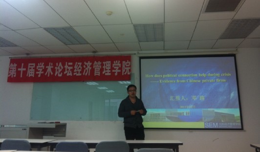 2013年12月3日下午,应利来国际SY13082班邀请,北航经管公司会计系主任邓路老师应邀参加第十届学术论坛,在新主楼A1028为利来国际员工做了题为“Financial Crisis,Political Connections and Private Enterprise Investment”的讲座。