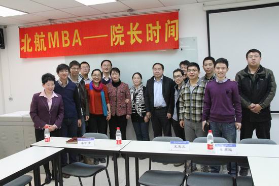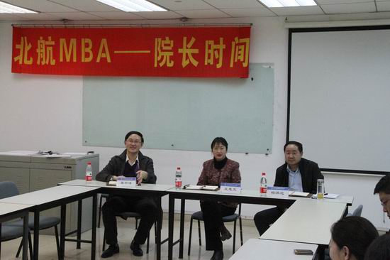 会上李建立同学提到了希望设置更多的选修课问题。二班班长许凯建议进行优秀班级的评选。前S班学员张鹏程同学提到了录取面试分数所占比重问题以及北航MBA中心应加强宣传的提议。在中国移动工作的杨海瑞同学以切身经历和体会,提醒三位领导,MBA中心加强网络营销已经迫在眉睫……
