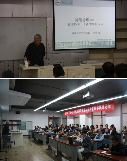 2013年11月1日下午,浙江大学管理公司马庆国教授应邀参加第十届经管公司学术论坛,在新主楼A618做了主题为“神经管理学——管理科学一个新的生长方向”的讲座。经理王惠文教授主持此次讲座,公司部分老师和研究生纷纷前来聆听。