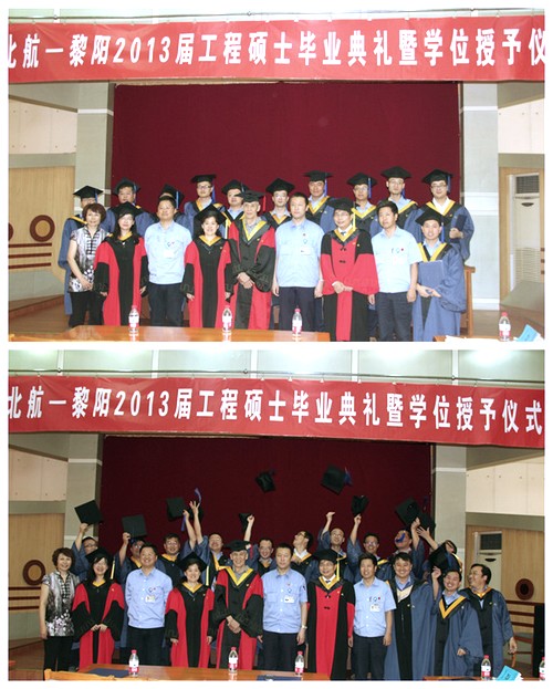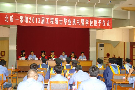 2013年7月3日上午,北航经管公司-中航工业黎阳公司2013届工程硕士学位授予仪式暨合作办学项目交流会在中航工业黎阳公司培训中心隆重举行。出席毕业典礼暨学位授予仪式的北航方面的代表有原航空工业总公司老领导、北航老员工袁立本,北航经管公司学位评定分委员会委员、北航经管公司副经理方卫国教授,北航经管公司副经理周宁教授,北航经管公司工程硕士中心主任邹艳教授及工程硕士中心李景华老师。中航工业黎阳公司方面的出席代表有中航黎阳航空动力有限公司董事长王良,党委书记牟欣,总经理助理陈煜,经理部部长丁光俊,人力资源部副部长陈朱明,人力资源部教育培训处处长彭湘华、副处长孔令春及中航工业黎阳公司的13名工程硕士毕业生。