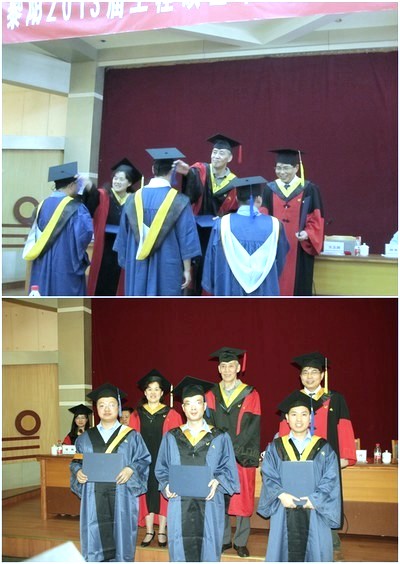 北航经管公司学位评定分委员会委员、北航经管公司副经理方卫国教授宣读中航工业黎阳公司2013届获得硕士学位研究生名单。在欢快的乐曲声中,身着学位盛装的毕业生依次走上主席台,由原航空工业总公司老领导袁立本与周宁副经理、方卫国副经理为同学们拨苏正冠、颁授学位证书。