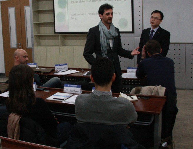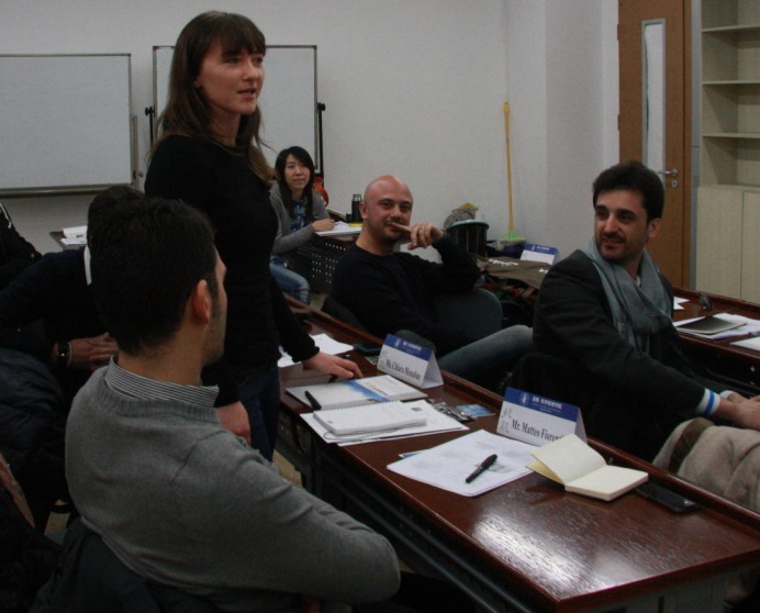 2013年3月11日,来自意大利米兰理工大学MIP管理公司的7名MBA交换生来到北航经管公司,开始为期一周的学习交流活动。上午9:00,北航MBA教育中心在A618为MIP的交换生举行了简短的欢迎仪式。欢迎仪式由公司12级MBA员工吴迪主持,经管公司副经理周宁教授致欢迎辞,公司外事助理郝金星博士介绍了北航及经管公司的情况,MBA教育中心副主任秦中峰副教授介绍了北航MBA项目的基本情况。之后,MIP交换生分别做了自我介绍,幽默的语言引来现场阵阵笑声。北航MB12081班的全体同学参加了欢迎活动。