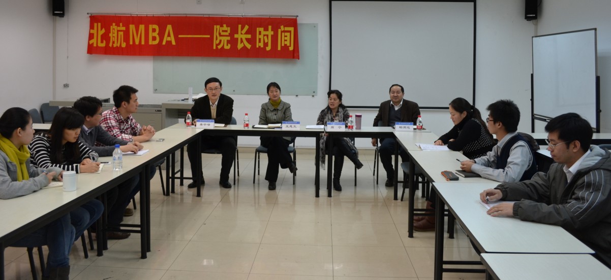 2012年12月8号17时,北航MBA教育中心在新主楼A949举办了“北航MBA—经理时间”座谈会。北航经管公司经理王惠文教授、副经理周宁教授,北航MBA教育中心主任柏满迎教授、副主任秦中峰副教授以及MBA教育中心李慧老师、张新华老师出席本次活动,与来自2011级和2012级的多名员工代表进行座谈。此次活动的主要目的是针对在读MBA员工在学习中遇到的问题和困难,以及他们对北航MBA的一些建议进行深入交流。