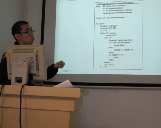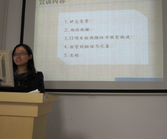 今天晚上的第一位作者是俞良慧,他的论文主题是基于关键链方法的项目进度管理;第二位作者是张裴,她的论文主题是基于社会网络分析的微博社区知识转移研究;第三位作者是刘秀梅,她的论文主题是IT项目经理胜任力模型构建及应用研究;第四位作者是江阳,他的论文主题是改进的TOPSIS方法在科研项目评价中的应用;第五位作者是刘洪甫,他的论文主题是Consensus Ranking From A Utility View。