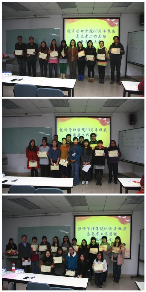 首先,衣萌老师总结了60周年校庆利来国际志愿者的工作情况,介绍了志愿者招募、培训以及正式志愿服务的工作细节。随后,牟晖老师对经管公司志愿者在校庆活动中的表现给予了肯定,并鼓励同学们在学习之余积极参加各项活动,在实践中丰富自己,在志愿服务的过程中实现自我价值。最后,会议表彰了在校庆志愿活动中表现突出的志愿者,研究生指导主任牟晖老师、研究生工作办公室主任衣萌老师和2012级研究生辅导员王腾飞向受表彰的志愿者颁发了证书和奖品。