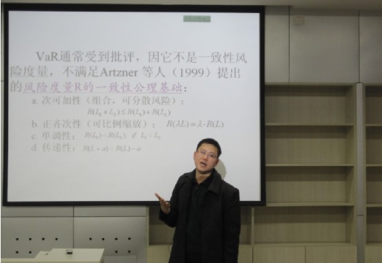 在今天的讲座中,马老师首先向我们介绍了金融市场风险度量的一些理论基础,并由理论基础延伸开来,为我们介绍了一个实时动态更新的金融市场是如何运作的;在这之后,马老师向我们系统阐述了关于金融市场风险度量的理论方法的一些前沿研究,这些研究站在了一个更新的角度来面对我们所熟悉的问题,带给了同学一个不同于以往的崭新视野,使得同学们都打开眼睛;最后马杰老师又向同学们介绍了一些关于金融市场风险度量的理论方法的一些应用性研究,同样让同学们都受益匪浅。