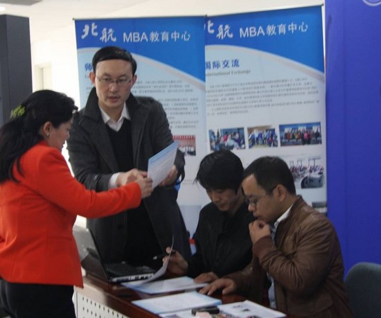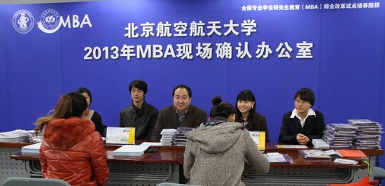 作为全国MBA综合改革试点院校的北航经管公司,为全面做好2013年MBA现场确认工作,基于专业化管理、人性化服务的理念,在总结前三年成功设立“北航MBA现场确认办公室”的成功经验基础上,北航MBA教育中心继续在研究生报考确认现场期间推出一系列人性化服务举措。11月初MBA教育中心在深入调研的基础上完成了现场确认期间的工作安排:10日至14日,中心主任及中心负责招生宣传老师们悉数在现场确认办公室办公,每天还有2—4名MBA学员到现场担当志愿者,共同为考生提供北航MBA招生政策咨询、2013年SMBA报名、宣传礼品派发、员工交流、休息休整等温馨服务,并推出了MBA知行论坛等系列活动。